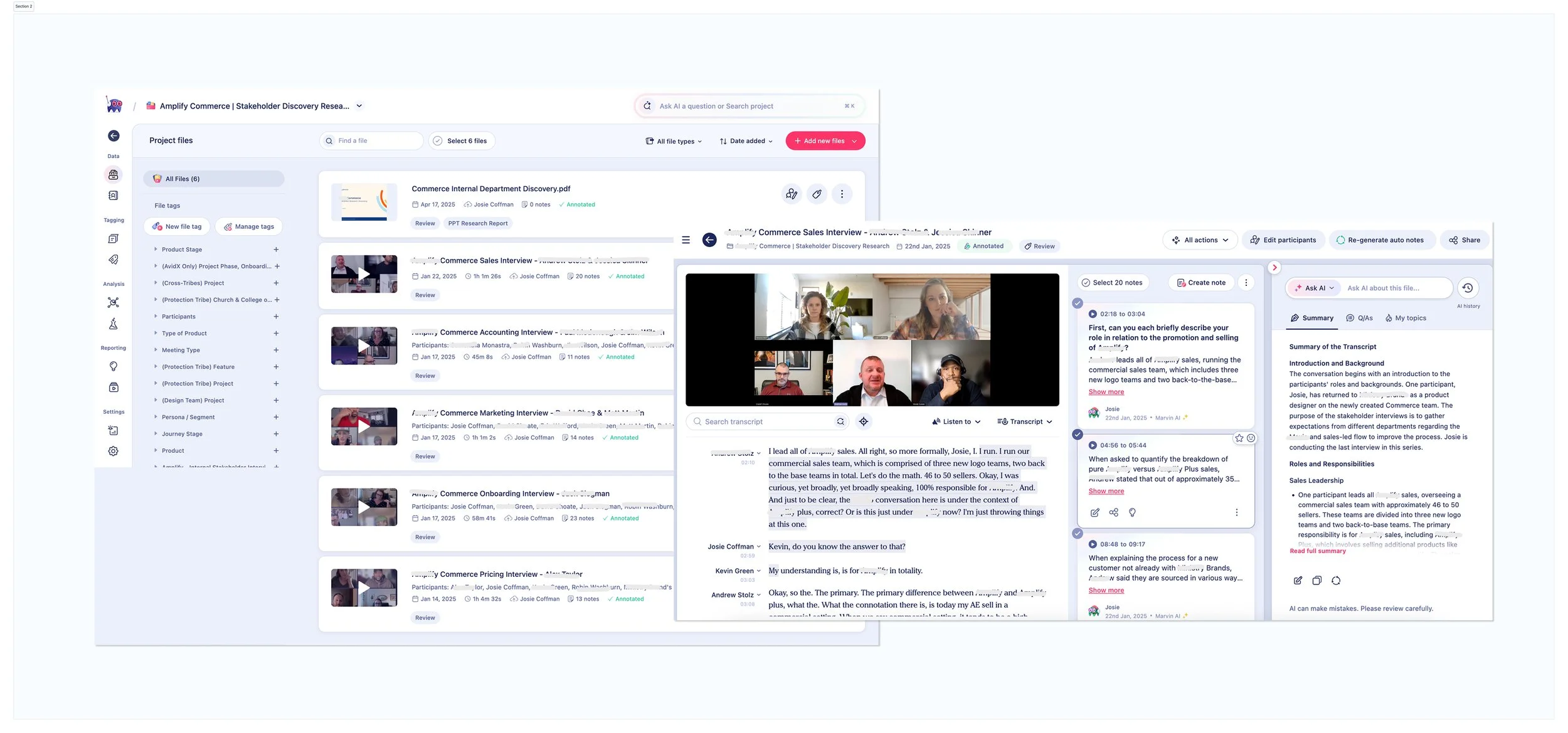 For each interview, I invited HeyMarvin to the call to support synthesis after the fact. Marvin’s AI-generated notes and insights helped streamline the analysis process, though I verified all outputs and pulled relevant video clips to highlight key moments.