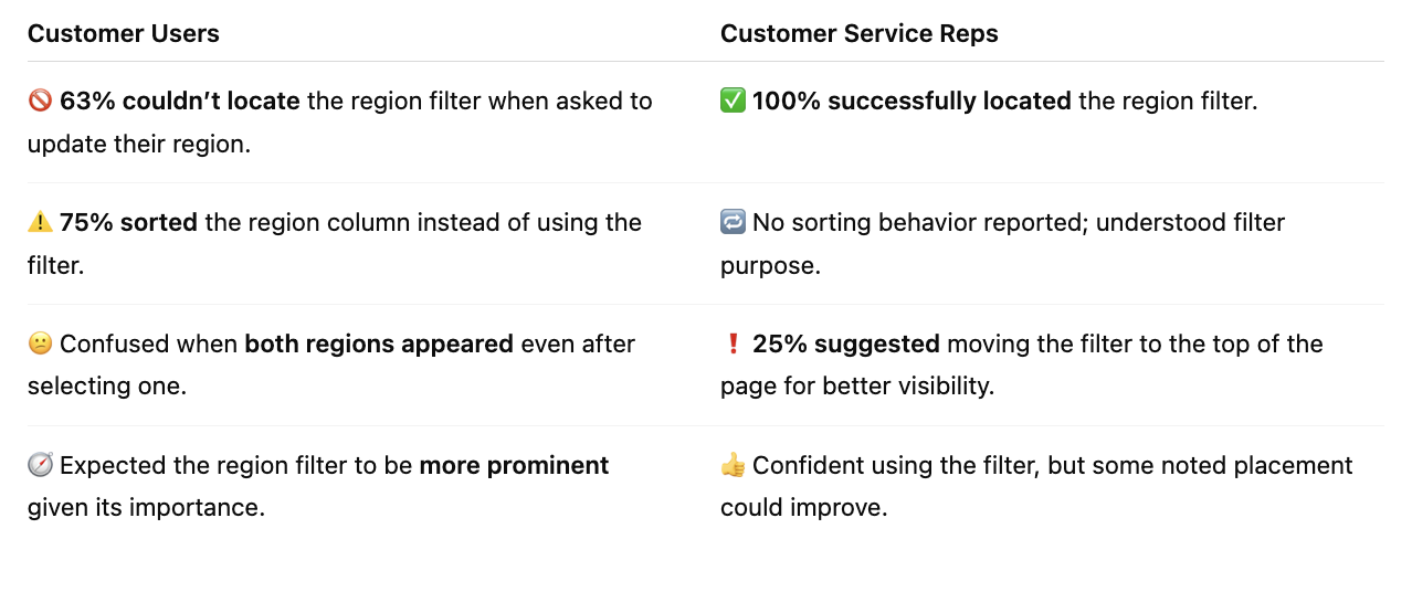 Key Insight: This was surprising, as we had expected the filter to be more valuable, particularly for customer service teams.